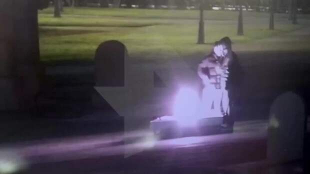 На записи с камер видеонаблюдения видно, как два человека подходят к мемориалу и сначала греют у пламени руки, а затем заливают его жидкостью из бутылки. Перед тем как потушить символ памяти, один из мужчин оглянулся по сторонам.