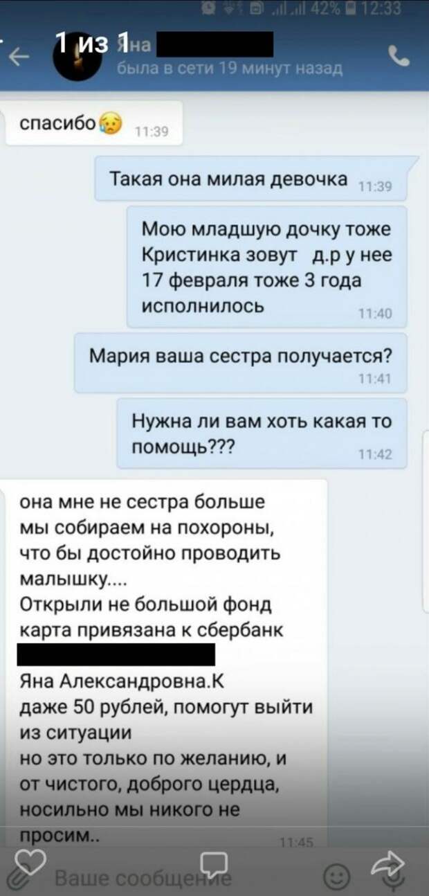 19-летняя Яна в соцсети "Вконтакте" написала, что ее страницу взломали и пишут другим пользователям с ее профиля с просьбой помочь перечислить деньги на похороны малышки.