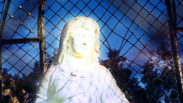Скриншот видео Но никакой мистики здесь нет. Все дело в свойствах белого мрамора. Он хорошо отражает лунный свет. А вот сияющие глаза статуи - дело рук студентов-хулиганов, которые ради шутки испачкали их фосфором.