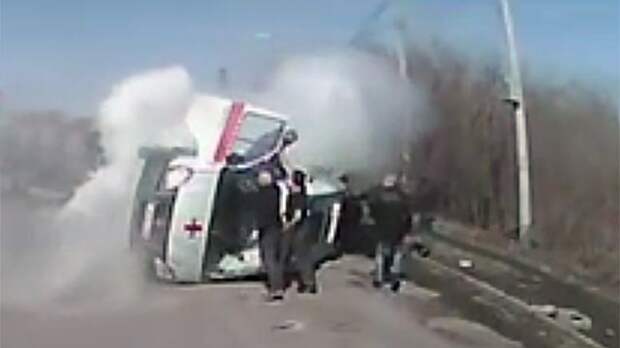 Карета скорой помощи перевернулась и загорелась на дороге в Челябинске. Инцидент попал в объектив видеорегистратора.