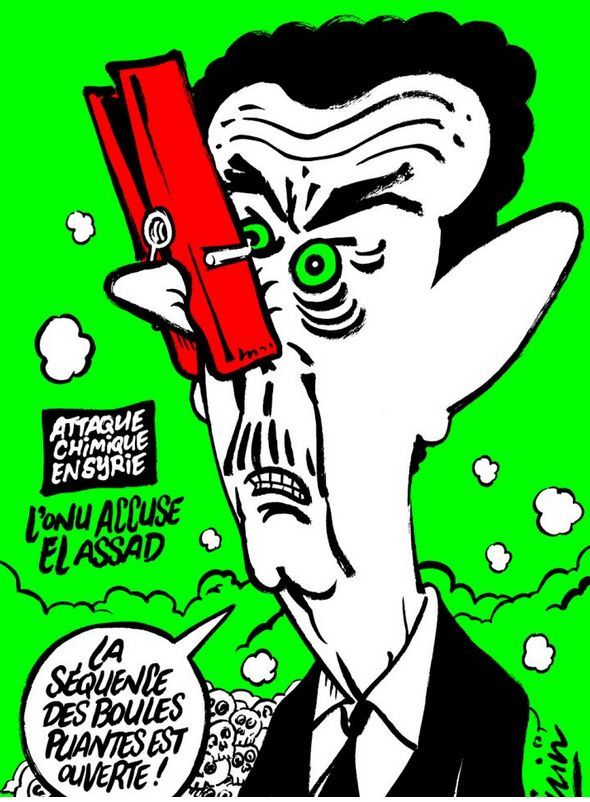 В сопровождающем картинку материале говорится следующее: "Тьфу! Что это за запах? Госпожа Ле Пен, Месье Фийон, вы ничего не чувствуете? Это душок смерти".Ранее Charlie Hebdo опубликовал карикатуру на так называемую "химическую атаку", о которой трубят западные СМИ и политики, не предоставляя каких-либо конкретных фактов. На картинке изображен президент Сирии Башар Асад с зажатым прищепкой носом. Ниже расположена подпись: "Химическая атака в Сирии. ООН обвиняет Асада. Вот они, последствия бомбардировки".