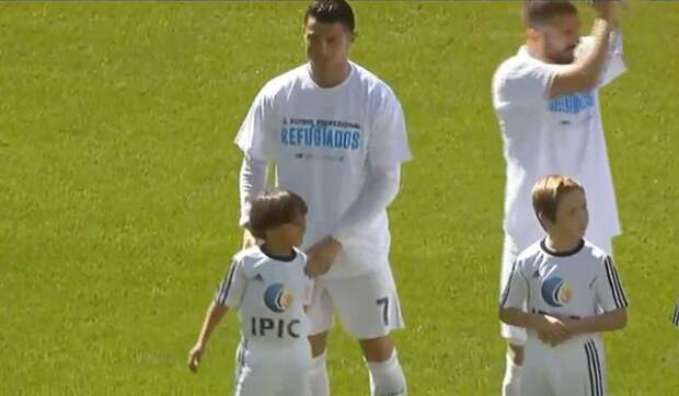 Игрок мадридского "Реала" Криштиану Роналду вышел на матч 4 тура чемпионата Испании, который состоялся в субботу, с маленьким беженцем из Сирии. Мальчик – сын мигранта, который стал известен после случая на границе Венгрии, когда фотограф Петра Лазло поставила ему подножку.