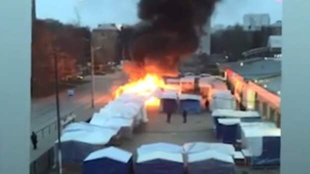 Очевидцы сняли на видео, как на территории рынка полыхают палатки. Пламя распространилось на площади в 100 квадратных метров.