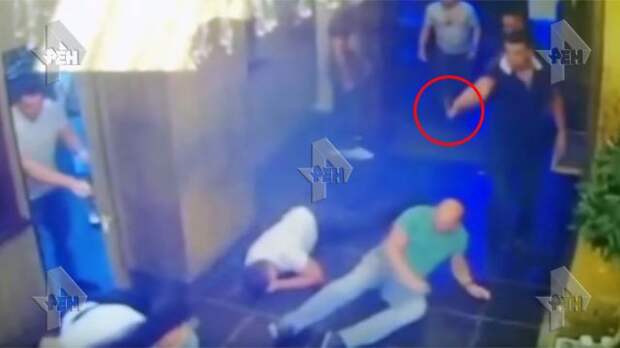На записи камер наблюдения запечатлено, как охранники достойно пытаются противостоять дебоширам, однако внезапно один из драчунов достает пистолет и начинает стрелять по охране.