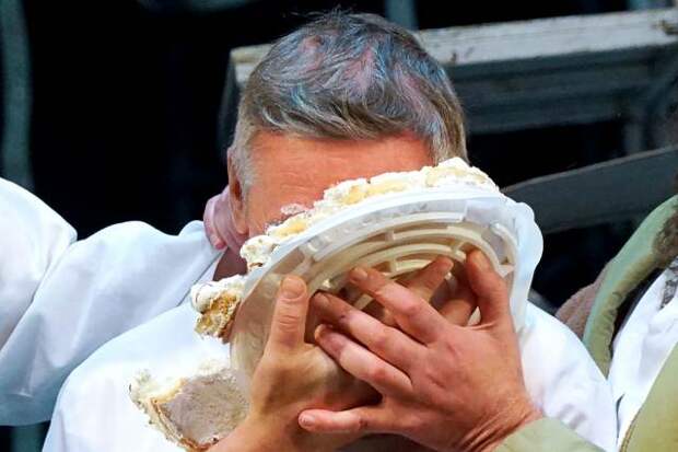 В Сети появилось видео поздравления актера Михаила Ефремова с 55-летием. На сцене прямо во время спектакля коллеги окунули его лицом в торт.