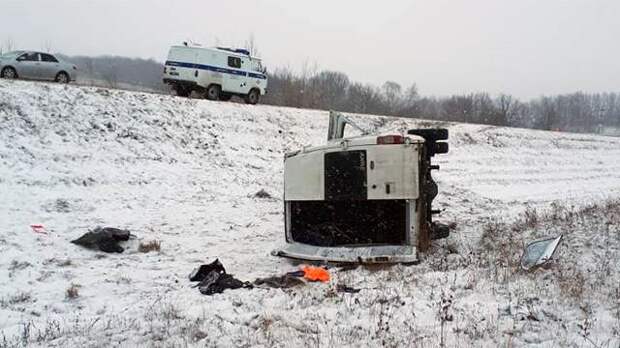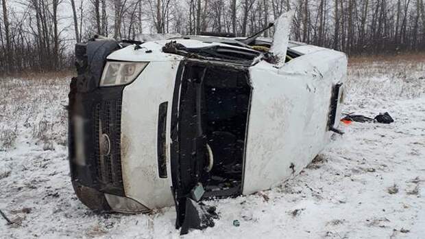 Микроавтобус FordTransit перевозил восемь человек. Водитель не справился с управлением, после чего автобус опрокинулся на бок.