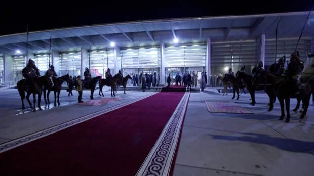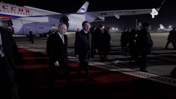Российского лидера в аэропорту Бишкека "Манас" у трапа встретил лично президент Киргизии Садыр Жапаров. Также там присутствовали артисты в национальных костюмах с борзыми собаками породы тайган и беркутами.