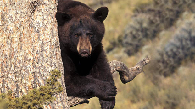 Местные жители сняли медведя на камеру. Бурый хищник сидит на ветке и внимательно смотрит на людей.