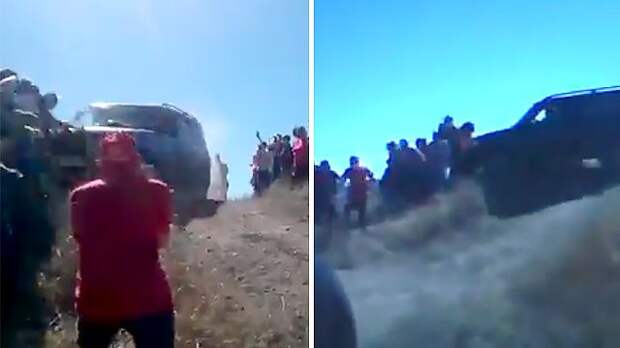 Джип на сложном участке трассы занесло и выбросило прямо на зрителей.