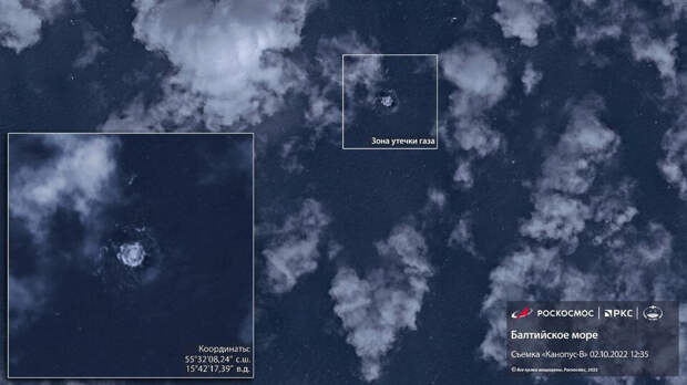 Госкорпорация "Роскосмос" показала, как выглядит место ЧП в Балтийском море на трубопроводах "Северный поток" и "Северный поток — 2". Снимок был опубликован в Telegram-канале корпорации.