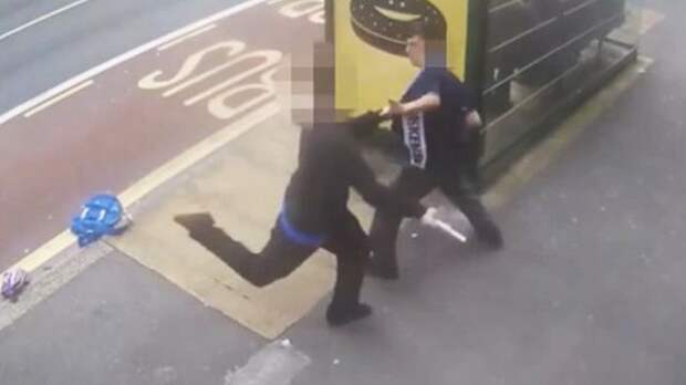 Молодой человек с металлической дубинкой набросился на прохожих в городе Плимут в Британии. Как видно на кадрах, мужчина перебежал через дорогу и ударил молодого человека по голове.