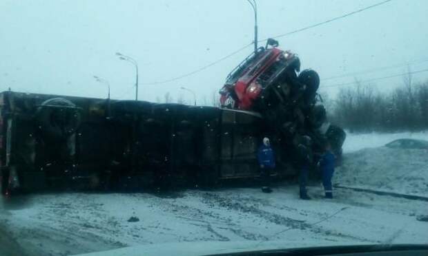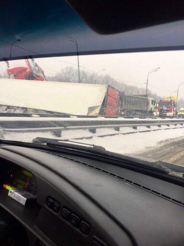 На снимках видно огромный полуприцеп, который практически полностью перекрыл трассу.