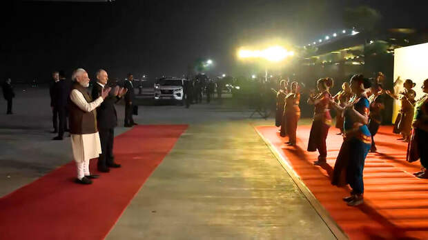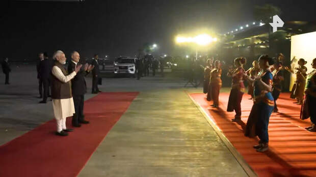 А по случаю прибытия высокого гостя индийские девушки исполнили танец в национальных костюмах. Политики поаплодировали танцовщицам.Затем Путин и Моди покинули авиабазу на одном автомобиле. По плану визит президента РФ начнется с неформального общения с премьер-министром Индии.