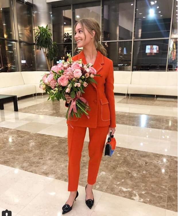 На фото Асмус в элегантном красном костюме позирует с роскошным букетом для певицы.