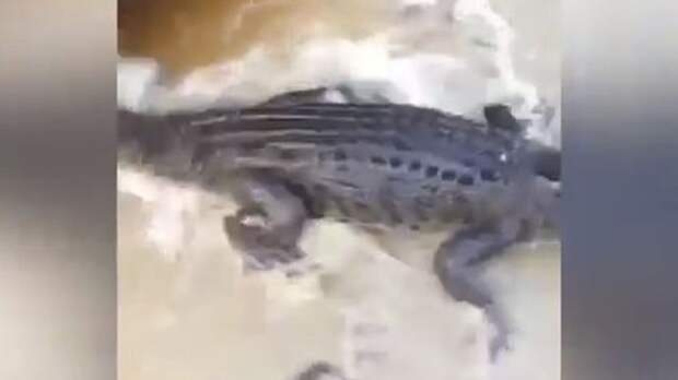 Девушки снимали на видео рыбу-бычка, выныривающую на мелководье. Внезапно на девушку напал крокодил.