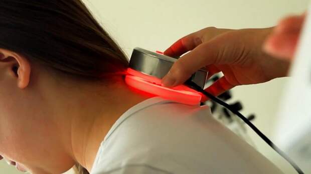 Так выглядит сеанс лечения звуком: аппарат воздействует на источник боли акустической волной, которая проникает в ткани и блокирует передачу болевых импульсов в головной и спинной мозг.