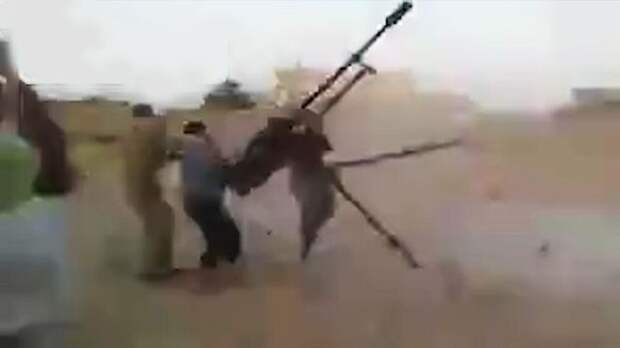 Едва только мужчины начинают стрельбу, корпус пулемета вместе с массивной станиной переворачивается от отдачи, а боевиков буквально отбрасывает от пулемета. Остальные присутствующие в кадре от греха подальше бросаются в рассыпную.