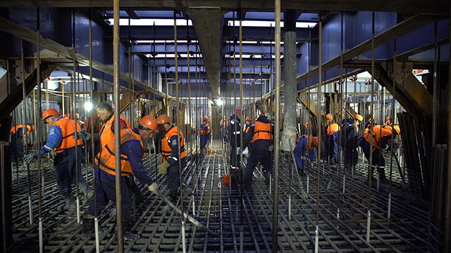 Строители приступили к очередному этапу: на свайном поле автодорожной части опоры формируется ростверк — монолитная железобетонная плита, "вяжется" арматурный каркас плиты, его постепенно бетонируют.