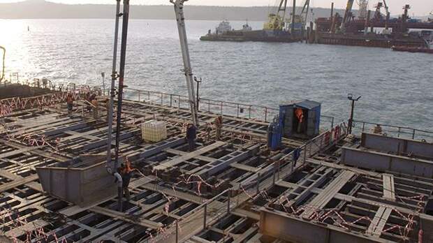 Строители приступили к первому этапу бетонирования одной из самых мощных опор Крымского моста. Две опоры будут держать над водой судоходные арки. Фундамент каждой такой опоры — это 95 свай из толстостенной стальной трубы.