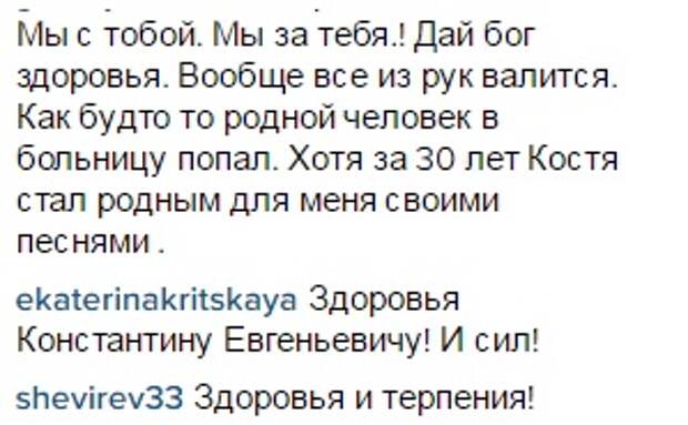 "Константин Евгеньевич находится в больнице. Был инфаркт. Состояние стабильное, все не так плохо. Все концерты группы отменены. Будем молиться, что Константин скоро поправится. Сходите в церковь, помолитесь за его здоровье. Будем стараться держать Вас в курсе. Мы вместе", – говорится в сообщении.