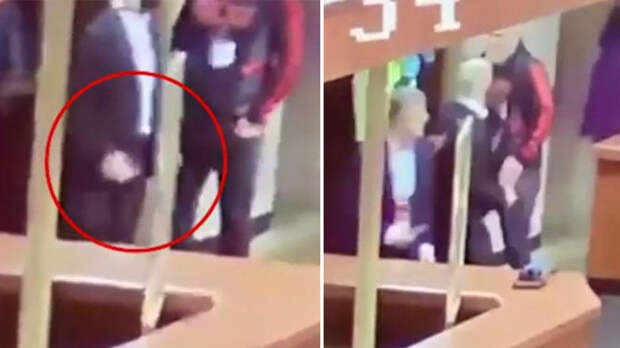 На этих кадрах видно, как Адам и Сергей выходят из зрительного зала на разговор. Харитонов, как отмечалось ранее, явно расслаблен - он спрятал руки в карманах, явно не ожидая того, что ему придется защищаться.