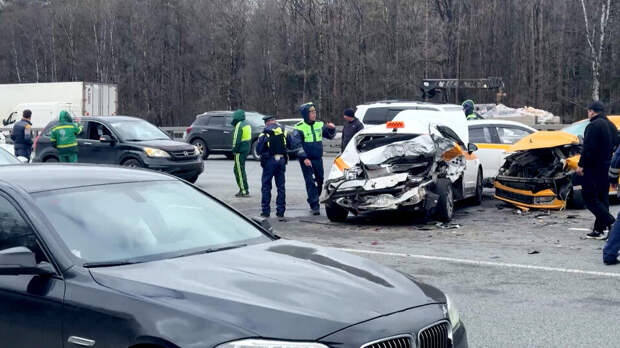 В массовом ДТП на Киевском шоссе в Москве столкнулись шесть автомобилей, в том числе три машины такси. Известно как минимум об одном пострадавшем. На месте аварии побывала корреспондент РЕН ТВ Татьяна Балыкина.