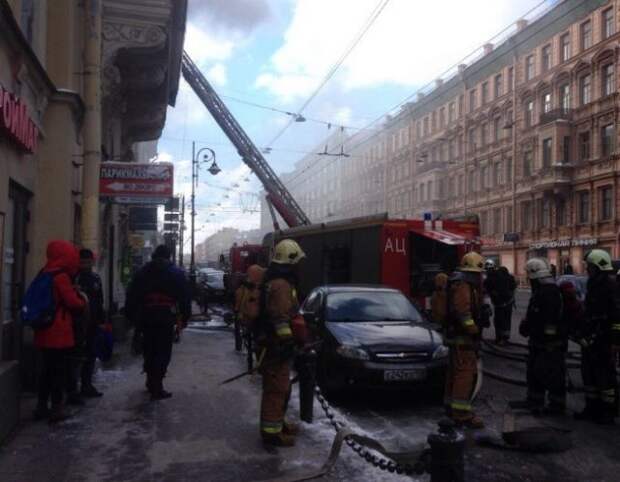 В центре Петербурга в здании вспыхнул пожар. Очевидцы сообщают о женщине, которая пытается спастись от огня через окно.