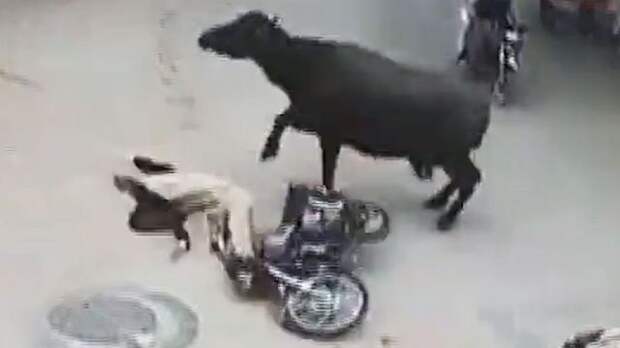 На кадрах видно, как животное неожиданно нападает на мужчину, который пересекает улицу на мотоцикле. Отметим, что животное атаковало именно водителя, а не его железного коня.