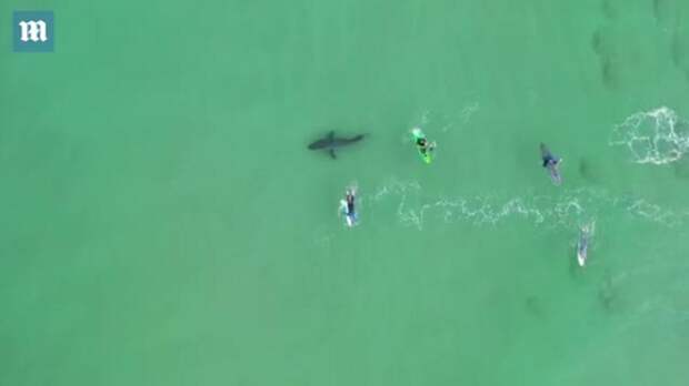 На кадрах видно, как большая белая акула подплыла к группе серферов, плавающих на волнах.