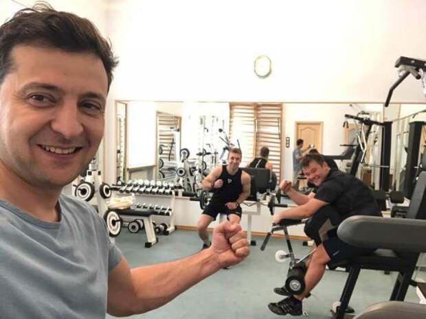 Президент Украины демонстрирует на фото мускулы на руке. Также в кадр попали глава администрации Андрей Богдан и личный тренер украинского президента.
