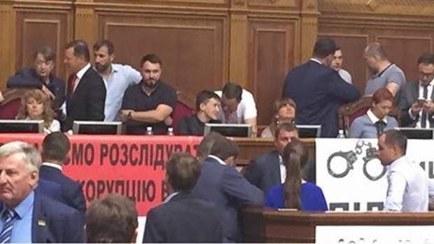 В настоящее время около 20 нардепов из двух партий сидят за президиумом, стоят у трибуны и занимают президентское место.