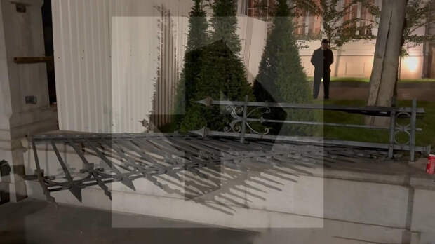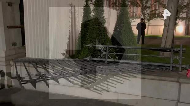 На видео можно заметить, как на лужайке у здания лежат металлические ограждения, которое снесли радикалы во время столкновения с полицией.