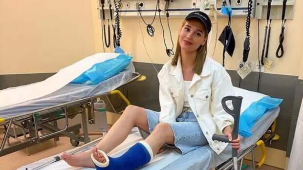 На снимке актриса сидит на кушетке в больничной палате в окружении капельниц. На левой ноге у нее красуется гипс, рядом - костыли.