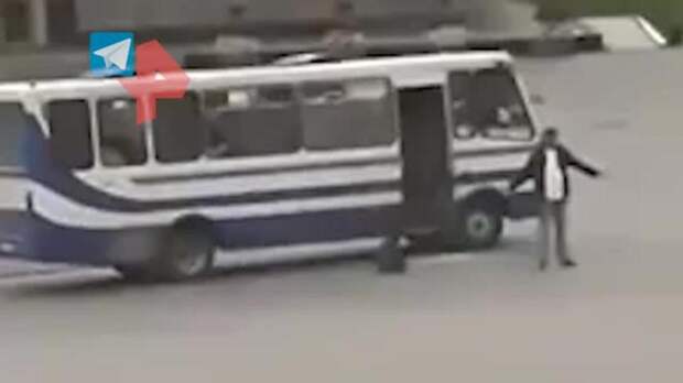 На видео показано, как мужчина стоит возле автобуса, прогуливается из стороны в сторону и даже разводит руками, как будто не понимая, куда делся спецназ, который, по логике, должен его задержать.