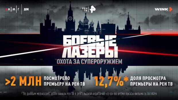 РЕН ТВ Премьеру документального фильма НМГ ДОК "Боевые лазеры. Охота за супероружием" на РЕН ТВ посмотрело более 2 млн россиян.