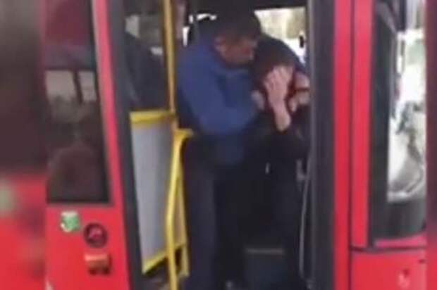На кадрах видно, как мужчина держит другого человека за шею и кулаком бьет по лицу, после чего локтем наносит удар по спине и выкидывает пассажира из салона автобуса.