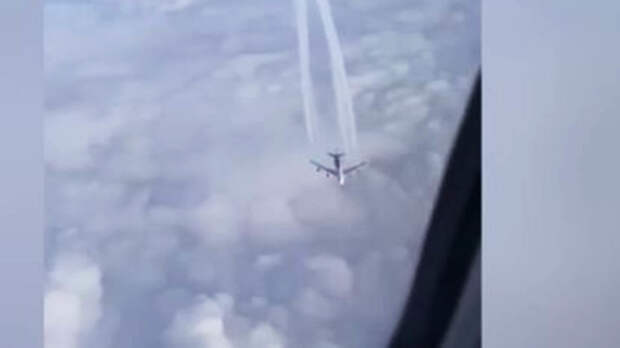 В кадре видно, что под одним из самолетов пролетает другой борт. Он оставляет за собой полоску из выхлопных газов и скрывается в облаках.