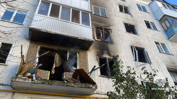 Также представители МЧС опубликовали фото, на которых видно, что взрывом было выбито много окон и разрушен балкон. Одна из квартир полностью выгорела.