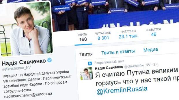 Верифицированный аккаунт бывшей украинской военнослужащей Надежды Савченко в социальной сети Twitter взломали хакеры. Согласно тексту на страничке Савченко, которую переименовали в "пародию на народного депутата Украины", над бывшей наводчицей пошутил общественный деятель Николай Дикобаев, который просит называть себя не хакером, а блогером.