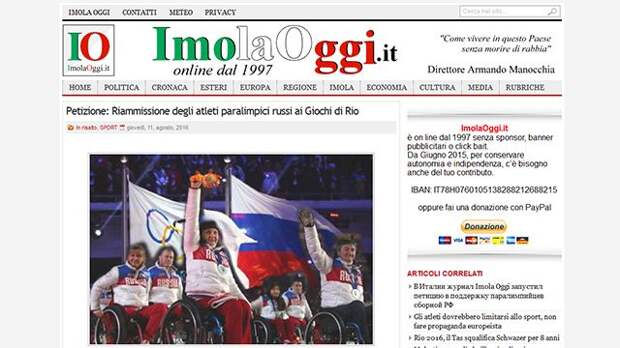 Итальянский журнал Imola Oggi заявил, что Международный паралимпийский комитет нарушает правила. По мнению журналистов, решение комитета об отстранении российских паралимпийцев необъективное, так как мотивировано политикой. И этого, по словам представителей журнала, надо стыдиться. Президента МПК Филипа Крэйвена журнал обвинил в некомпетентном поведении.