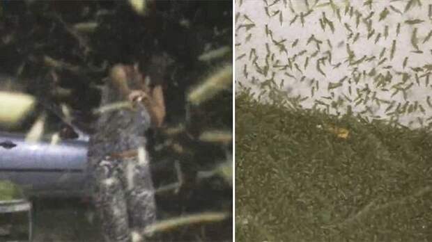 На кадрах ролика видно, как полчища насекомых, похожих на саранчу, заполонили все пространство вокруг его дома.