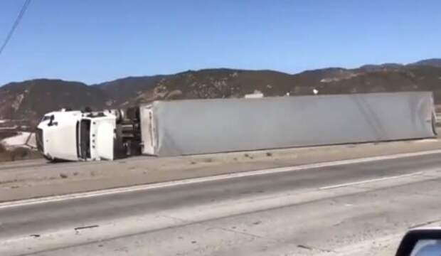 Инцидент произошел в районе Лос-Анджелеса накануне. Порывы ветра были такой силы, что большегрузы опрокинулись. Известно, что скорость ветра в некоторых районах Калифорнии превысила 80 км/ч.