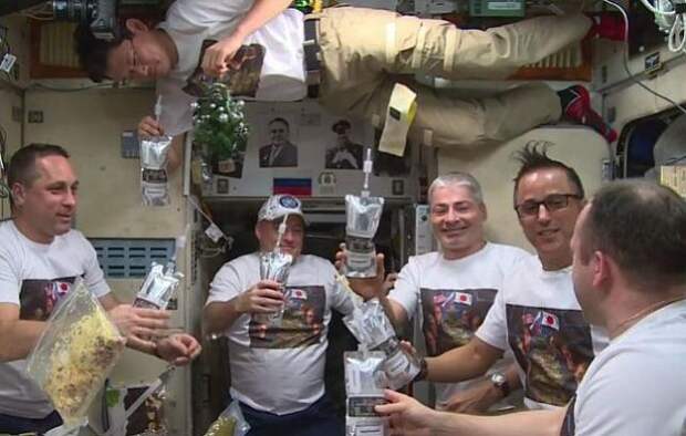 Позже российские космонавты подняли пакеты с шампанским. Кстати астронавтам, работающим на МКС, не запрещено отмечать наступление Нового года неоднократно, пролетая над часовыми поясами, где праздник уже наступил.