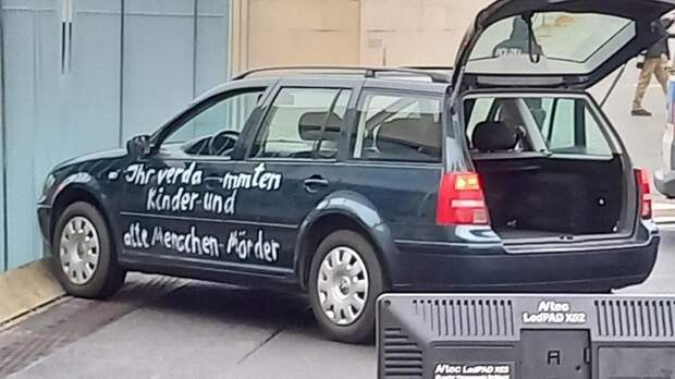 В Сети появились кадры, снятые у офиса канцлера ФРГ Ангелы Меркель в Берлине. Сегодня ворота здания протаранил автомобиль, на котором написано "Вы проклятые убийцы детей и стариков".