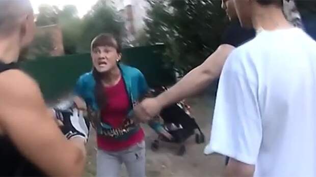 Несколько раз попытавшись ударить оператора, одна из девушек решила перевести дух. В одной руке сигарета, в другой – коляска с ребенком. Видимо, даму нисколько не волнует здоровье малыша.