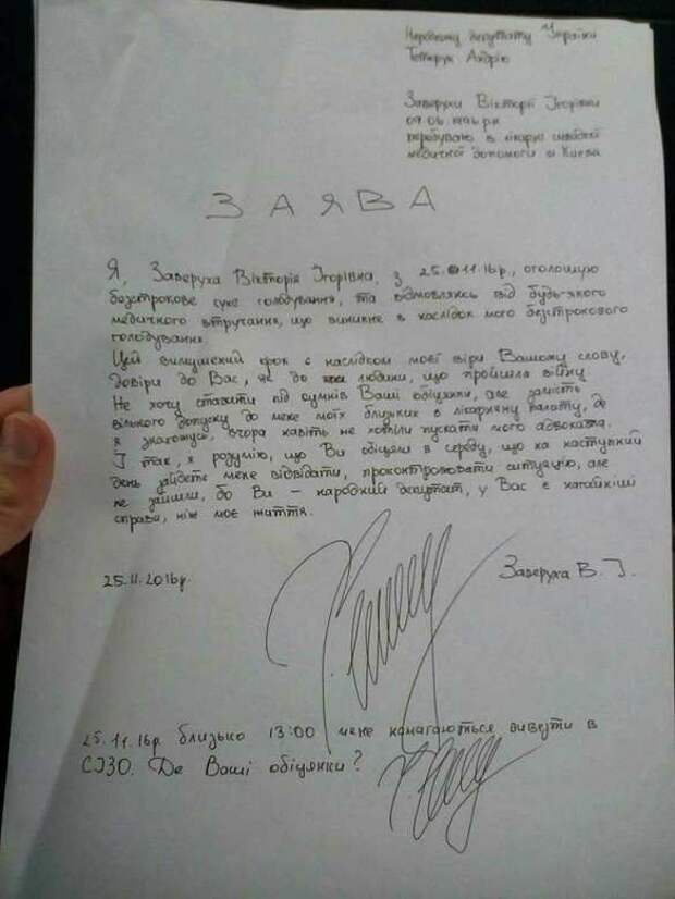 Заверуха написала обращение к нардепам Верховной рады, в котором сообщила о начале сухой голодовки.