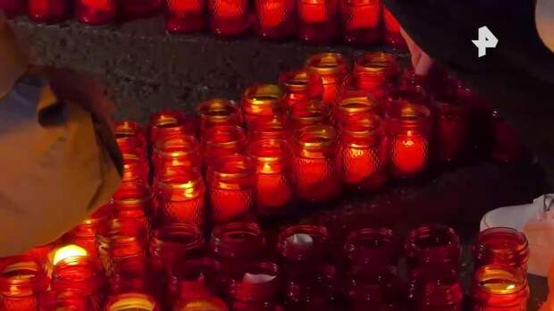 Молодые люди выложили из лампад надпись "Скорбим 22.03.2024", а вдоль фасада ТЦ "Сигма" зажгли 150 свечей в знак сопричастности к общей скорби.