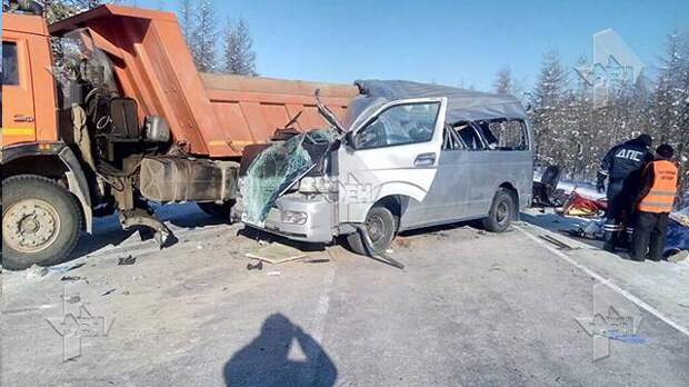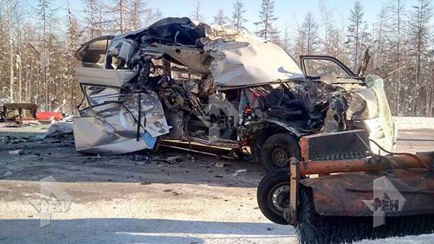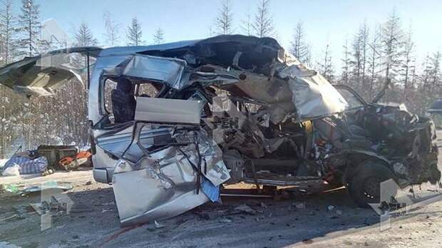 В распоряжении РЕН ТВ оказались кадры с места страшной аварии в Якутии. Микроавтобус и фура столкнулись на 143 километре федеральной трассы "Вилюй". 4 человека погибли и еще 9 пострадали, они доставлены в больницу. Один из них находится в тяжелом состоянии.