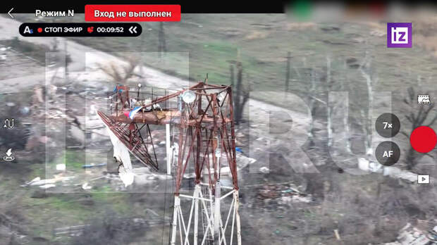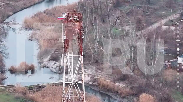 Военнослужащие ВС РФ установили российский флаг на верхушке телевышки в центре освобожденного Северска. Эксклюзивные кадры, снятые на камеру беспилотника с высоты птичьего полета, появились в распоряжении "Известий".