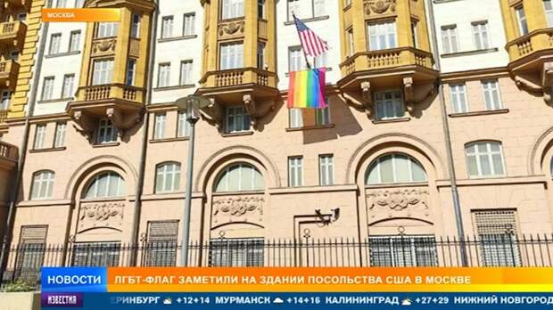 Здание американского посольства сегодня попало во все новостные сводки. Блогеры и просто прохожие заметили, как рядом со звездно-полосатым флагом появилось радужное полотно - провисело всю ночь. К обеду его убрали, но через час повесили снова.